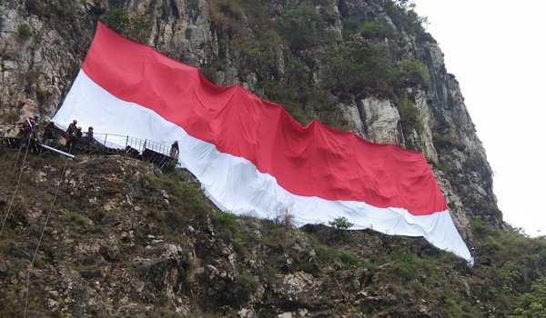 BANDUNG BARAT | TRIKUPDATE.CLIK-Menjelang HUT ke-80 RI, organisasi Laskar Merah Putih (LMP) mengibarkan bendera Merah Putih berukuran raksasa seluas 800 meter persegi di Tebing Gunung Masigit, Kabupaten Bandung Barat. Aksi ini dilakukan sebagai simbol semangat persatuan dan nasionalisme yang kokoh.