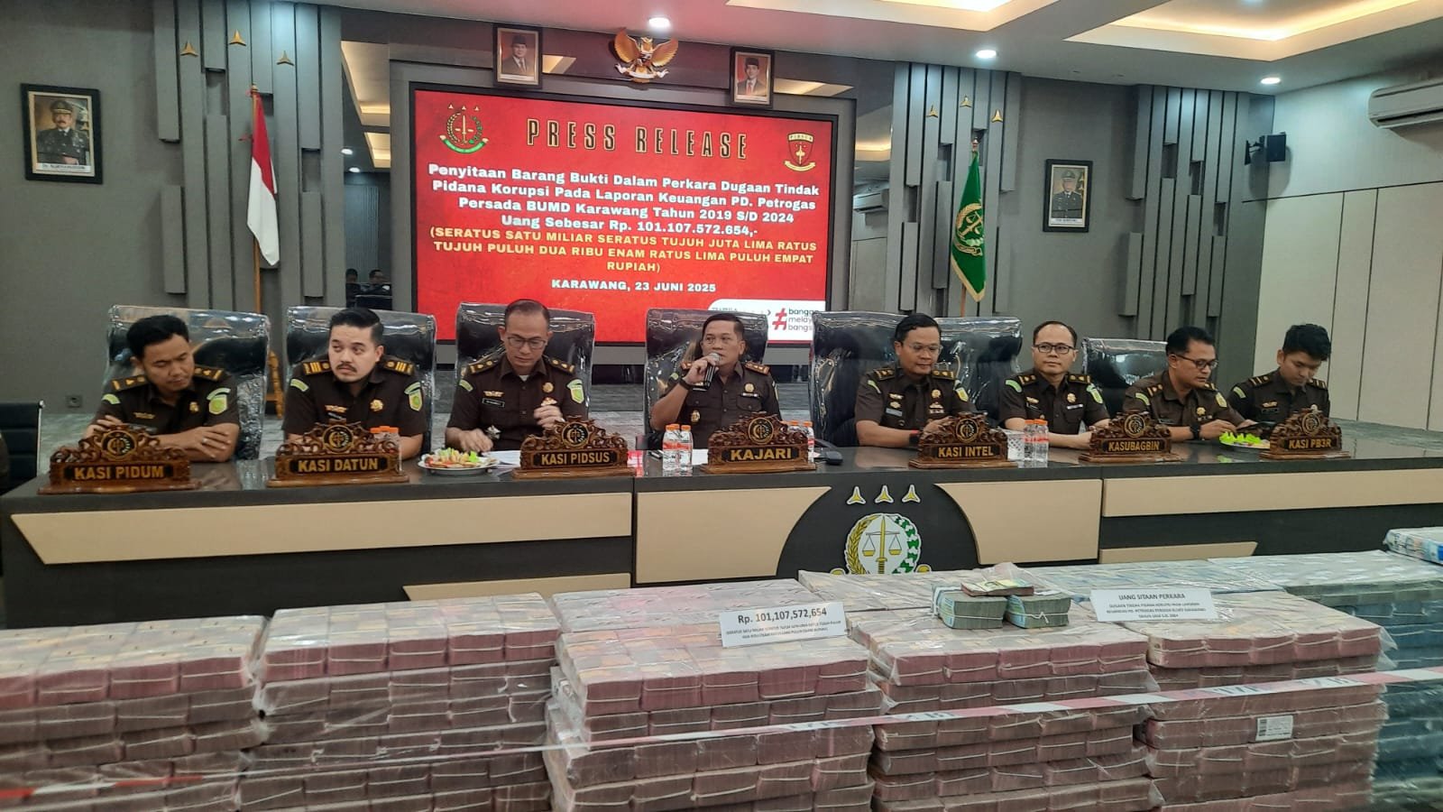KARAWANG | TRIKUPDATE.CLIK | Kejaksaan Negeri (Kejari) Karawang menyita uang senilai Rp101.107.572.654 dari dua rekening Bank Jabar milik Badan Usaha Milik Daerah (BUMD) PD Petrogas Persada. Penyitaan dilakukan dalam rangka pengusutan kasus dugaan tindak pidana korupsi pada laporan keuangan perusahaan tersebut sepanjang periode 2019 hingga 2024.